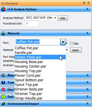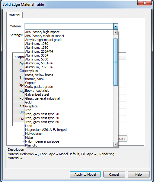 Solid Edge EcoDesigner, supporte les matériaux définis dans la base de données matérielle de Solid Edge. Au besoin, il est possible de personnaliser cette liste avec des matériaux exotiques ou brevetés par votre compagnie, toujours dans le but d'avoir une analyse de l'impact environnemental la plus juste possible.